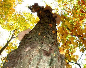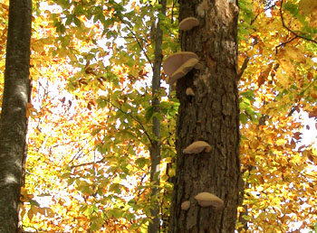 下の画像はムキタケです。 高い場所に生えていたので棒で突き落としました〜♪。ムキタケって身が厚く、高級キノコとか〜? バター焼きにしたら