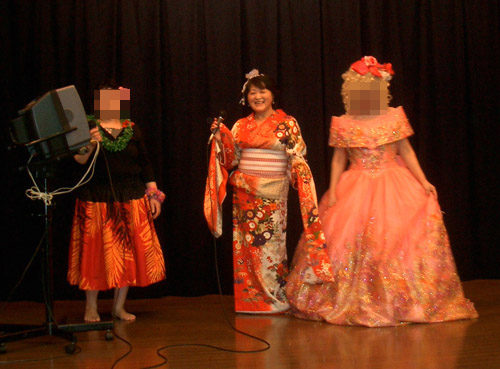 | 今日は、恒例の健康フラ・サークルの反省会でした(^-^〃)♪ 生涯学習発表会が終了すると、慰労も兼ねて、ささやかなご褒美なんですよ〜(=^ε^= ) 場所は、岩盤浴でもご紹介したことがある、紫雲閣の宴会会場で楽しんで来ました♪ (チョッピリ紫雲閣の宣伝も兼ねています(^_-)-☆) ここの宴会場では、好きな衣装が無料で借りられてカラオケが出来るという、女性にとっては何とも嬉しい話でしょ?(=^ε^= ) イメージチェンジを大いに楽しみながら、飲んで食べて、踊って、歌って・・・、疲れた〜(〃´o`)=3 フゥ (2007.3.1) ・・・☆・★・☆・☆・★・☆・☆・★・☆・☆・★・☆・☆・★・☆・・・ 今年は1枚だけ、ご紹介しますね〜。 下の画像は、振袖着て「潮来花嫁さん」を歌っています♪