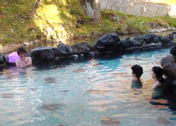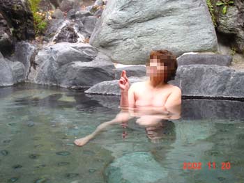 秋田県の稲住温泉・混浴露天風呂です。 彼女達は、数年前の鳥海山登山からのお友達。皆さんも、なごやかな雰囲気にすっかりはまってま〜す。 |