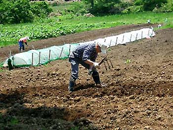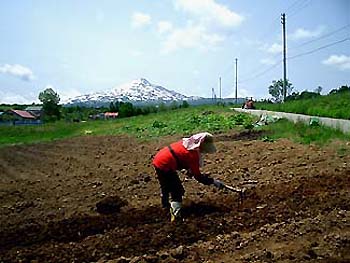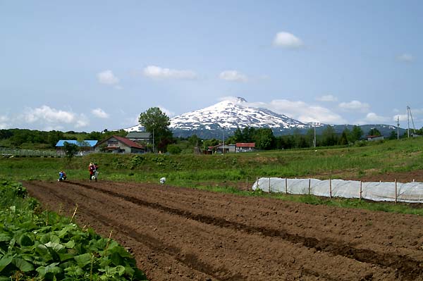 今日の鳥海山です♪ 雪解けが進み、鳥海山の変化が楽しみな時期でもあります♪ 少しズームで撮りましたが、この時期の残雪にしては、例年より多い気がします。 でも、暑い日に雪山が眺められるのは、とっても気持ちいいですよ〜♪ (撮影場所:上原 撮影時間:午前8時半頃) ![]() 友達に案内された場所は、道路の傍の傾斜のある、赤土で粘土質。 土堀り作業は固くて大変でした〜(^-^;) 彼女曰く 「開拓農家のお百姓さんの苦労を味わうには、最高〜(^_-)-☆」とニヤリ! 「は〜〜い、充分味わいさせて頂きました〜(~=~;)」 (撮影場所:上原 撮影時間:午前11時半時頃) ![]() ![]() ![]() 全く肥料が無い場所とのことなので、鶏糞と化成肥料をを少し入れているところです。 この後、黒豆大豆の種を2粒づつ蒔き、終了したのが11時45分。 「お疲れ様〜〜♪」と労をねぎらいながら、 自分にも 「ハ〜〜イ、疲れました〜@@;」と返事した(^_-)-☆ 下の画像は、おまけです(^_-)-☆ 山芋契約栽培のための、マルチ作業のための畝作りしているところとのこと。 白く見えるドームの中で、山芋の芽を出しているところとか。 よく働きますね〜〜(^-^;) 脱帽〜〜! (撮影場所:上原 撮影時間:午前9時半時頃)
