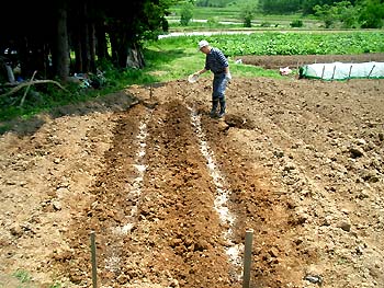 | 好天になった今朝、先月主人の母から頂いた黒豆の種を蒔きたくなり、「畑の端でいいから、黒豆を蒔きたいんだけど、場所ある〜?」と聞いたら、「全く肥料っけの無い場所があるから、おいで〜♪」とのこと。 枝豆に肥料はあまり必要ないですからね〜(^-^;) (2006/6/2) |