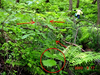 この写真の丸の中はアイコです。蟻酸を含んだトゲがあって、素手では採れません。軍手が基本。
