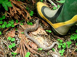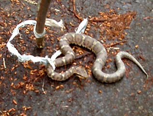 何と、主人の同級生がマムシ発見! 頭を足で踏みつけ、紐で括って棒に結び、お持ち帰り〜(~=~;)