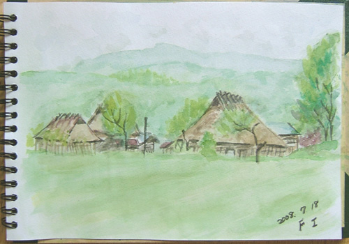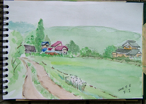 ここは、ここは、由利本荘市鳥海町・上笹子色田集落の風景。 手前は田圃ですが茅葺屋根の住宅をメインに描いてみました。 出来上がった絵を、オバちゃん達二人(この茅葺屋根の家の分家の人とのことでした) に見て貰ったら凄く喜んでくれ、 インゲンの規格外れを沢山頂いてしまいました〜(^-^;) ![]() |