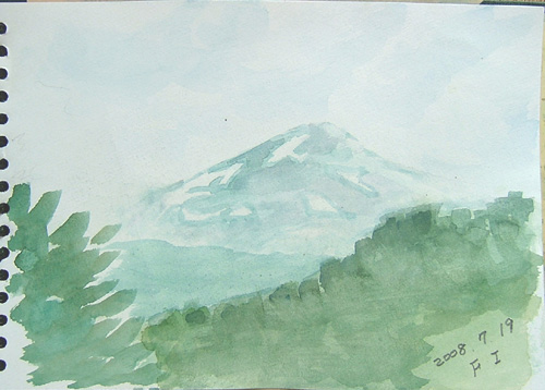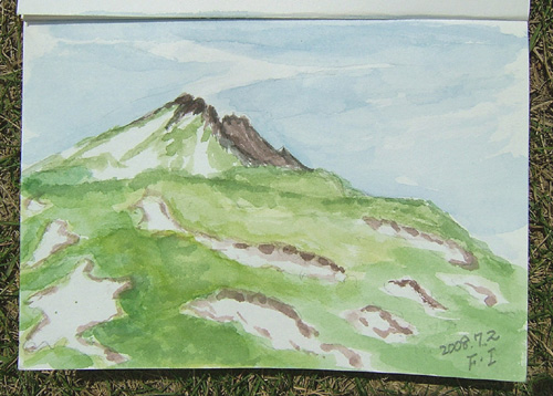 鳥海山5合目の展望台に向かって歩き、手前の左側で鳥海山と稲倉岳が見える場所でスケッチ開始。 今回は、残雪だけをメインにして、記念に描きました♪ だいたい、あってますよ〜(^-^;) ![]() |