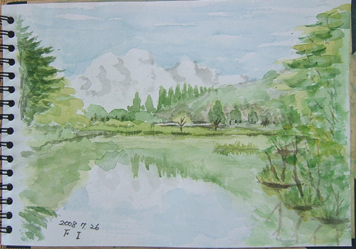 ここは、由利本荘市矢島町・熊之子沢付近の用水池の風景です。 高原にある用水池で、風も弱くて水面に映った空と雲が綺麗でした♪ 雲の描き方、いまいち〜(^-^;) ![]() |