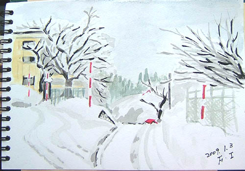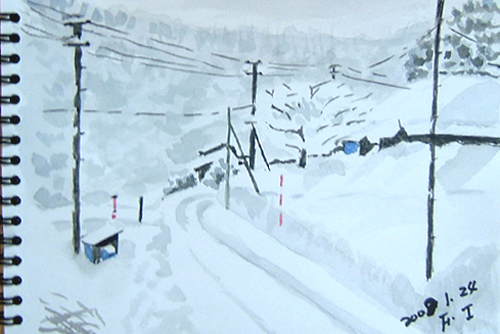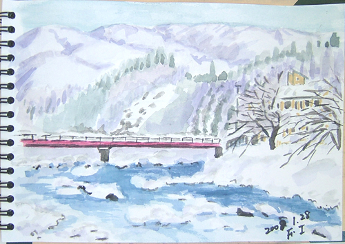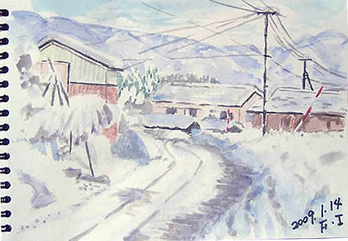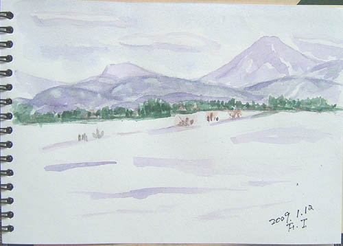 今日のスケッチの現場は、由利本荘市鳥海町・川内小学校と桜の木。 昨年末の初雪の時に学校のシンボルとなっていた枝垂れ柳の老木は 根元から折れて倒れてしまい、今は無くなりました。 で、本日の出来上がり〜(^-^;) 曇り空ですが、暖かい日でした(^-^;) 詳しくはこちら でご覧頂けます。 ![]() 本当に久しぶりに午前中は陽が差していたので近場の牧場へ出かけ、 広い雪原と山形県と秋田県との県境にある丁岳(左)と我が町にある遠上山(右)を描きました。 で、本日の出来上がり〜♪ 詳しくはこちら でご覧頂けます。 ![]() で、本日の出来上がり〜♪ 温度も上がり、暖かい日でした(=^▽^=) 詳しくはこちら でご覧頂けます。 ![]() |
