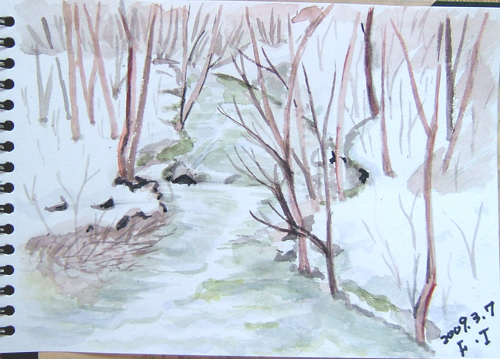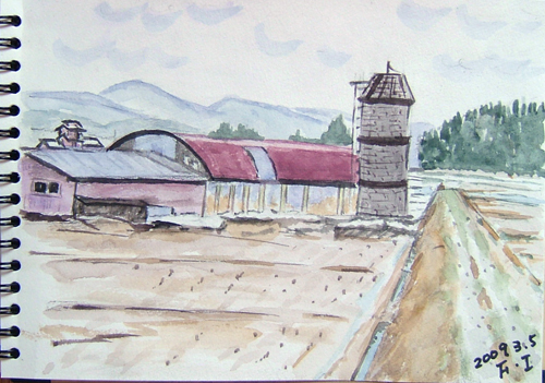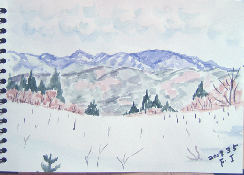 今日のスケッチの現場は、由利本荘市由利町、南由利原高原にある 「ゆり高原ふれあい牧場」の近くで、雪原と山々を描いたり、 国道108線手前の西滝沢周辺(由利町)の牛舎も描いて来ました〜♪ で、本日の出来上がり〜(^-^;) 詳しくはこちら でご覧頂けます。 ![]() ![]() で、本日の出来上がり〜♪ 詳しくはこちら でご覧頂けます。 ![]() なんと、いつの間にか薄曇り空になってしまいました(^-^;) こちらから見る鳥海山の方が、スケッチには迫力あってイイそうですよ〜(=^▽^=) で、本日の出来上がり〜♪ 詳しくはこちら でご覧頂けます。 ![]() 小さな造池を入れて旅館の一部を描きました。 水面に映った残雪や旅館を描きたかったですが、 早く温泉に入りたいと思う気持ちが雑になり・・・ (ノ_-;)ハア… 、恥ずかしいけど記念に〜(^^;☆\(▼▼#) で、本日の出来上がり〜♪ 詳しくはこちら でご覧頂けます。 ![]() |
