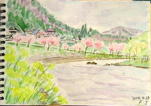 今日の現場は、鳥海町大栗沢の集落をバックに、子吉川の桜を描きましたよ