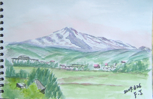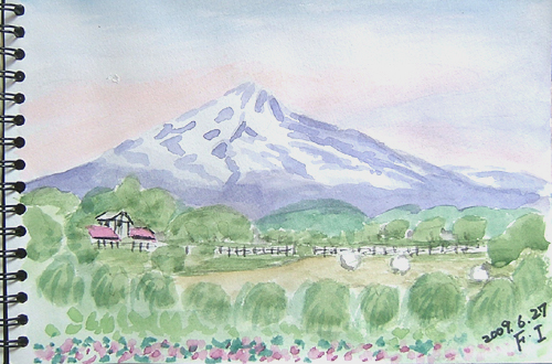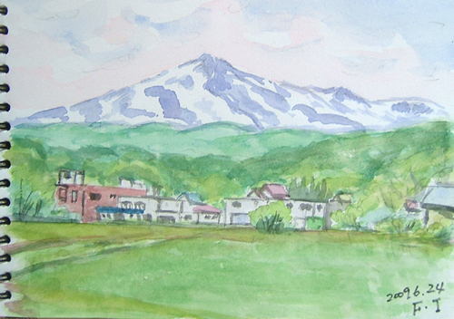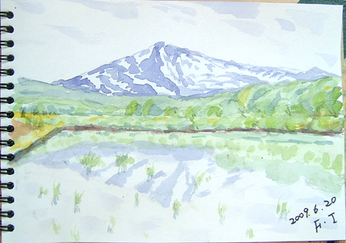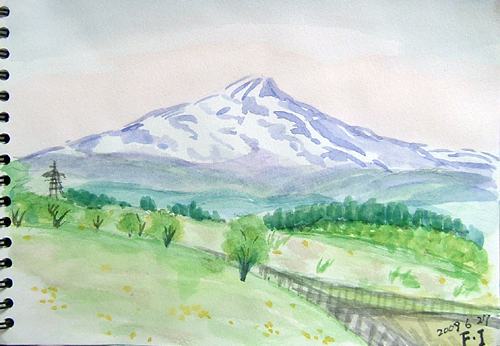 前にも描いた桃野からの鳥海山ですが、 その近くの休耕田の水面に映る鳥海山を描いてみました♪ 今回は9時前に現場について、30分位で描いたんですよ〜ヾ(≧▽≦)ノ で、今日の出来上がり〜(^-^;) 詳しくはこちら でご覧頂けます。 ![]() 国道108号線から矢島中高一貫校へ至る道路からの眺めで 左よりのレンガ色の建物は佐藤医院です。 で、今日の出来上がり〜(^-^;) 詳しくはこちら でご覧頂けます。 ![]() 実は最初の絵失敗して、これは2枚目の絵です。 で、今日の2枚目出来上がり〜(^-^;) 詳しくはこちら でご覧頂けます。 ![]() 何と、今日も2枚スケッチしましたよ(^-^;) で、今日の1枚目出来上がり〜(^-^;) 詳しくはこちら でご覧頂けます。 ![]() 2枚目は、チョッと場所変えて、 同じ、上原地区にあるゴミ焼却場の近くからの鳥海山です♪ で、今日の2枚目出来上がり〜(^-^;) 我が町の鳥海山と、矢島町の鳥海山との違い、分かりますか? 裾が広がって無く尖って見えますよ〜\(☆^∇゚)o ![]() |