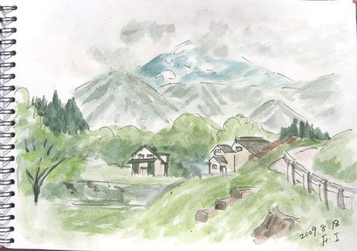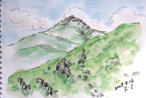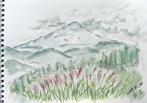 何と鳥海山登山誘われて、記念スケッチまでして来ました〜♪ とりあえず、8合目と9合目の間まで、出会った人とお喋りしたり、 写真撮ったりと、マイペースで久々の登山でした(^-^;) 最初の現場は 今日の1枚目現場は 由利本荘市・鳥海山9合目手前の、 3年前の想い出の場所です♪ で、今日の1枚目出来上がり〜。 あれ? ちょっと、尖がり鳥海山ね〜(^▽^;) ![]() 2枚目の現場は、同じ場所で、下界を描きました〜♪ 殆ど15分足らずの簡単スケッチです(^-^;)。 2枚目出来上がり〜♪ 確かに簡単、でも雰囲気出てると思うけど〜(^▽^;)。 ![]() 3枚目の現場は、帰宅途中の7合目の上の、残雪と水のある風景です♪ これも、15分ですね〜(^▽^;) 3枚目出来上がり〜♪ ![]() 詳しくはこちら でご覧頂けます。 *:..。o○☆*゚¨゚ ・*:..。o○☆*゚¨゚゚・*:..。o○☆*:..。o○☆*゚¨゚゚・*:..。o○☆*゚¨゚゚・*:..。 午後のバトミントン予定がキャンセルとなり、 突然スケッチに誘われて近場をライブヾ(>▽<) 今日の第一現場は 由利本荘市鳥海町・猿倉集落からの鳥海山スケッチでしたが、 山頂は雲に隠れてよく観えませんでした〜 で、今日の1枚目出来上がり〜。 失敗でも、更新です(^▽^;) ![]() 1枚目描いてから、帰宅途中の才ノ神集落裏山からの鳥海山見ると、 あらら〜その姿が次第に見え始めたので、 又またスケッチになってしまいました〜(^-^;) 2枚目出来上がり〜♪ きんぎょの方が、アバウトですが、短時間ですから〜\(☆^∇゚)o ![]() 詳しくはこちら でご覧頂けます。 *:..。o○☆*゚¨゚ ・*:..。o○☆*゚¨゚゚・*:..。o○☆*:..。o○☆*゚¨゚゚・*:..。o○☆*゚¨゚゚・*:..。o 今日の現場は今日は由利本荘市・本荘公園からの風景です。 境内には神社もあり、公園から北の方位には、ピンクの建物第一病院、 近くにジャスコ、マックスバリュ、 遠くには組合病院など目立つ建物が眺められました。 で、今日の出来上がり〜。 アバウトですが更新です(^▽^;) ![]() 詳しくはこちら でご覧頂けます。 |