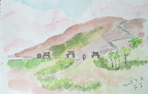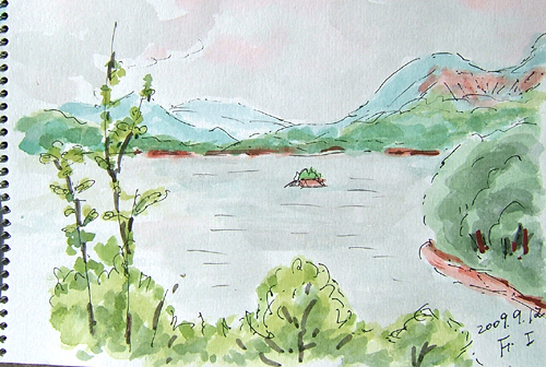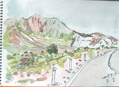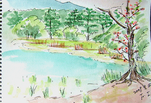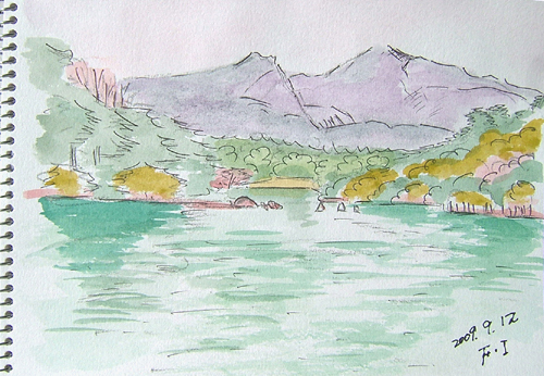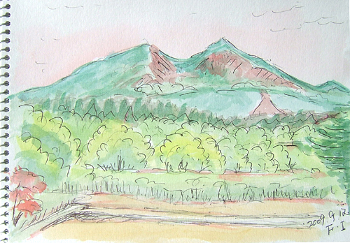 *:..。o○☆*゚¨゚ ・*:..。o○☆*゚¨゚゚・*:..。o○☆*:..。o○☆*゚¨゚゚・*:..。o○☆*゚¨゚゚・*:..。o *:..。o○☆*゚¨゚ ・*:..。o○☆*゚¨゚゚・*:..。o○☆*:..。o○☆*゚¨゚゚・*:..。o○☆*゚¨゚゚・*:..。o 12日〜13日と、高速道路1000円を狙って、 温泉1泊スケッチ旅行して来ました〜(^-^;) 12日早朝4時起きで4時半頃出発。 休憩しながらも、裏磐梯・五色沼ビジターセンターには、9時半頃溶着。 早速、目の前に広がる一番大きな毘沙門沼をスケッチして、赤沼、弁天沼まで散策。 それから、大きな桧原湖一周ドライブしながら、途中で又1枚スケッチ 反対側の五色沼自然探勝路から又散策して、 柳沼、青沼、ルリ沼まで散策して、ルリ沼でスケッチ 宿泊先には3時半到着。 そこで、マタマタスケッチとは、 もう、病気ですね〜(≧▽≦)ノ で、一枚目の現場は、五色沼ビジターセンター傍の毘沙門沼から、 磐梯山が何とか見えたのでスケッチ♪ 1枚目出来上がり〜♪ 右の高い方が磐梯山です(1819m) 手前に山があるのでラクダの背中みたいね〜 ![]() 枚目の現場は、「桧原湖・ひばらおおはし」の横空き地からスケッチ、 デッサンは立って、色づけは寒いので車中でした。 2枚目出来上がり〜♪ ![]() 3枚目の現場は、反対側の裏磐梯高原ホテルから散策して、 柳沼、青沼、ルリ沼まで行き、ルリ沼でスケッチ。 磐梯山より、木に巻きついたツル性の植物の紅葉が綺麗でしたので、 きんぎょはこちらを描きました♪ 3枚目出来上がり〜♪ ![]() 4枚目の現場は、裏磐梯休暇村の宿泊ホテルの部屋から又またスケッチ。 4枚目出来上がり〜(^-^;) やはり、右の高い方が磐梯山で、ラクダの背中のような景色が印象的ですね♪ ![]() *:..。o○☆*゚¨゚ ・*:..。o○☆*゚¨゚゚・*:..。o○☆*:..。o○☆*゚¨゚゚・*:..。o○☆*゚¨゚゚・*:..。o 二日目は、磐梯・吾妻スカイライン(有料)ドライブして、浄土平に到着。 凄い強風にビックリ。 風速28mとか?? で、1枚目は当然有料駐車場から、車中で登山コースをスケッチでした。 1枚目出来上がり〜♪ ![]() 2枚目は、「浄土平まつり」のイベント(迫力ある太鼓など)を楽しんだり、 浄土平付近の禿山をスケッチ(浄土平から少し下ったところでスケッチ) 2枚目出来上がり〜♪ ![]() 詳しくはこちら でご覧頂けます。 *:..。o○☆*゚¨゚ ・*:..。o○☆*゚¨゚゚・*:..。o○☆*:..。o○☆*゚¨゚゚・*:..。o○☆*゚¨゚゚・*:..。o |