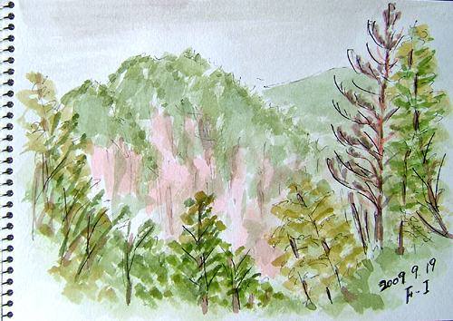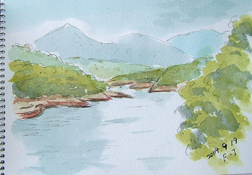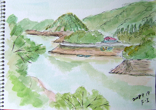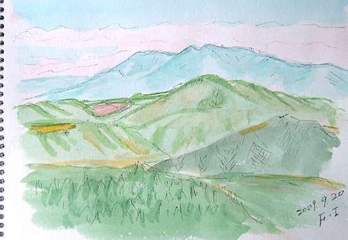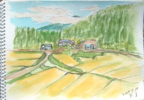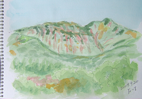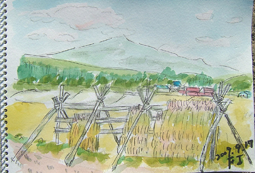 午前中、稲刈り前の黄金色した田園風景を描きに地元ドライブ♪ で、一枚目の現場は、由利本荘市鳥海町姥ヶ懐台の田園風景です。 今はなかなか見られなくなった稲架(はさ)掛けですが、 餅米の収穫は手刈りで刈り取った稲を 稲架(はさ)に掛けて乾燥させているんですよ〜。 1枚目出来上がり〜♪ (9時ころ) この時間はまだ鳥海山が見えました♪ ![]() 2枚目の現場は、由利本荘市鳥海町村木の田園風景です 山沿いの農家の田圃は、棚田っぽい黄金の田園風景です♪ ここにも、ソバ畑が少しありました。 2枚目出来上がり〜♪(鳥海山が少しだけ見えてます♪・・10時頃) ![]() 昨日は時間無いので1枚だけ描きました ![]() 詳しくはこちら でご覧頂けます。 *:..。o○☆*゚¨゚ ・*:..。o○☆*゚¨゚゚・*:..。o○☆*:..。o○☆*゚¨゚゚・*:..。o○☆*゚¨゚゚・*:..。o *:..。o○☆*゚¨゚ ・*:..。o○☆*゚¨゚゚・*:..。o○☆*:..。o○☆*゚¨゚゚・*:..。o○☆*゚¨゚゚・*:..。o 秋の5連休シルバーウィーク高速道路1000円を狙って、 19日〜22日まで3泊4日で、お墓参り(八王子市)&スケッチ旅行して来ました〜♪ 19日早朝3時起きで3時半頃出発。 休憩しながらも、栃木県川俣温泉(奥鬼怒川方面)に到着するまで3枚描き、 到着後も部屋から鬼怒川上流スケッチで計4枚も描きました〜(^▽^;) 1枚目の現場は、川俣湖へ向かう途中の萱峠付近での風景をスケッチです。 1枚目出来上がり〜♪ なんだか苦手な景色ね〜 ![]() 2枚目の現場は、川俣湖・川俣大橋より下流方向をスケッチです。 2枚目出来上がり〜♪ ダムの景色の方が好き〜(^▽^;) ![]() 3枚目の現場は、川俣湖・川俣大橋より上流方向のスケッチです。 3枚目出来上がり〜(^▽^;) ![]() 4枚目の現場は、川俣温泉・ふくよ館の部屋のベランダでデッサン部屋で色づけ。 4枚目出来上がり〜 急いで描いてますね〜(^-^;) ![]() 2日目の朝は、当然温泉に浸たったり、 間欠泉を観に散歩に出かけたりしてから朝食。 早めにチェックアウトして、スカイブルーの 日光の霧降高原を通過しながら、スケッチ2枚。 で、1枚目は霧降高原から下界をスケッチです。 主人は、きんぎょより右下の下界です。 1枚目出来上がり〜♪ ![]() 2枚目は、霧降高原から赤薙山方面をスケッチです。 2枚目出来上がり〜♪ ![]() 3日目は、八王子インターから中央高速・首都高速・常磐道と 首都高速では渋滞に巻き込まれながらも、 牛久大仏様で昼食後スケッチ1枚してから牛久で1泊。 1枚目出来上がり〜♪ 人出が多くて、車中で描きました(^▽^;) ![]() 詳しくはこちら でご覧頂けます。 *:..。o○☆*゚¨゚ ・*:..。o○☆*゚¨゚゚・*:..。o○☆*:..。o○☆*゚¨゚゚・*:..。o○☆*゚¨゚゚・*:..。o |