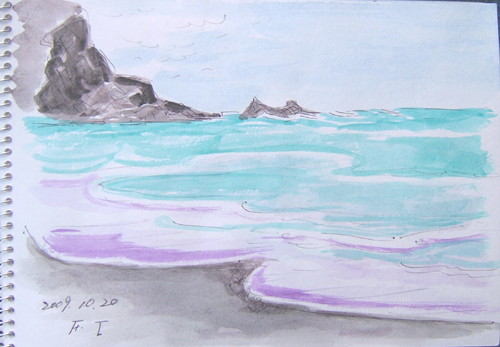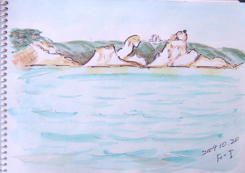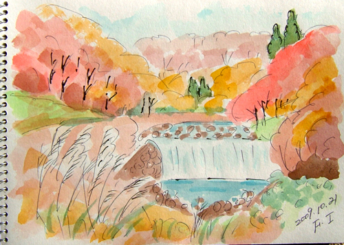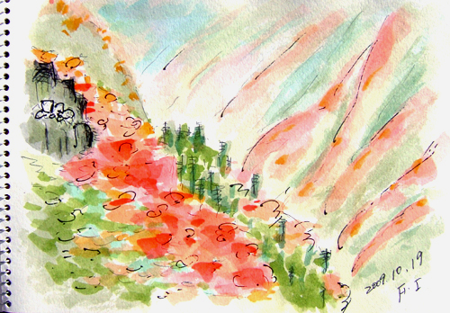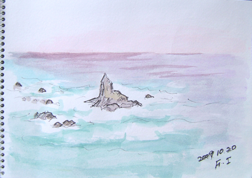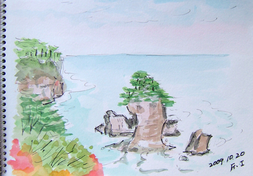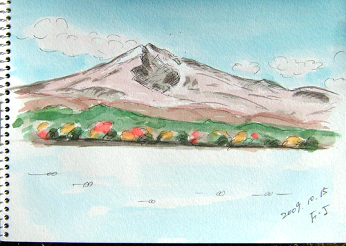 今朝も初冠雪鳥海山がブルースカイに映えて素晴らしかったので、 市内に用があったついでに寄り道してスケッチ1枚だけして来ました〜(^▽^;)。。 1枚目の現場は、由利本荘市・大谷地池からの鳥海山です♪ ここからの鳥海山は、頂上がラクダの背中のコブのように見えます。 本日の出来上がり〜♪ ![]() 詳しくはこちら でご覧頂けます。 *:..。o○☆*゚¨゚ ・*:..。o○☆*゚¨゚゚・*:..。o○☆*:..。o○☆*゚¨゚゚・*:..。o○☆*゚¨゚゚・*:..。o *:..。o○☆*゚¨゚ ・*:..。o○☆*゚¨゚゚・*:..。o○☆*:..。o○☆*゚¨゚゚・*:..。o○☆*゚¨゚゚・*:..。o 19日〜21日まで、2泊3日で岩手県の紅葉眺めながらスケッチドライブでした。 岩手県は我が町より紅葉が進んでいて、もう、紅葉真っ盛り♪ とっても綺麗でしたよo(*^▽^*)o で、3日間で、なんと9枚のスケッチ(^▽^;) 1日目は岩手県の紅葉。2日目は岩手県・宮古市の三陸海岸。 3日目は、岩手県や秋田乳頭温泉郷の紅葉です。 1枚目の現場は、岩手県、錦秋湖から少し下った湯田ダムの 渓谷風景紅葉スケッチです。 1枚目出来上がり〜♪ ![]() 2枚目の現場も同じ場所で、少し下を見るとチョロっと川の水のある景色です。 2枚目出来上がり〜♪ ![]() 3枚目の現場は、翌日、宮古市・田老港山王岩を展望台よりスケッチです。 この時期の海岸は、観光客も居なくて、気が楽でした〜o(*^▽^*)o 3枚目出来上がり〜(^▽^;) ![]() 4枚目の現場は、真崎海岸展望台よりスケッチです。 4枚目出来上がり〜♪ ![]() 5枚目の現場は、同じく真崎海岸より右側スケッチです。 5枚目出来上がり〜♪ ![]() 6枚目の現場は、田老港・沢尻海岸、砂浜よりスケッチです。 ここでは、とんだハプニングありましたが、ナイショ(^^;☆\(▼▼#) 6枚目出来上がり〜♪ ![]() 7枚目の現場は、浄土ヶ浜にてスケッチです。 一部、岩が恐竜に見えるんですよ〜o(*^▽^*)o 7枚目出来上がり〜♪ ![]() 8枚目の現場は、帰宅途中、岩手県下閉伊郡川井村・松草というところの風景です。 主人とは同じ場所でも、反対方向の鉄道のある風景を選びました〜\(☆^∇゚)o 8枚目出来上がり〜♪ ![]() 9枚目の現場は、帰宅途中、乳頭温泉郷の大釜温泉の裏の方の紅葉スケッチです。 スケッチ後、鉄分含んだ温泉に浸って来ましたよ〜\(☆^∇゚)o 9枚目出来上がり〜♪ ![]() 詳しくはこちら でご覧頂けます。 *:..。o○☆*゚¨゚ ・*:..。o○☆*゚¨゚゚・*:..。o○☆*:..。o○☆*゚¨゚゚・*:..。o○☆*゚¨゚゚・*:..。o |