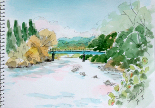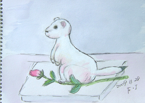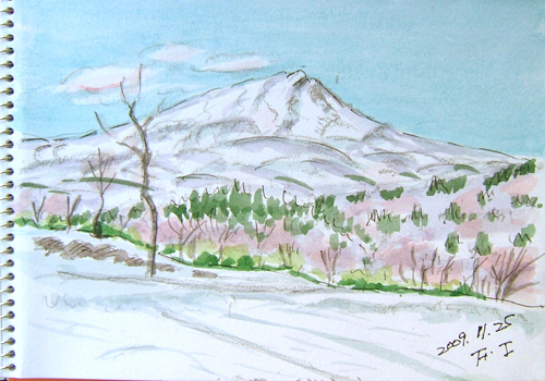 *:..。o○☆*゚¨゚ ・*:..。o○☆*゚¨゚゚・*:..。o○☆*:..。o○☆*゚¨゚゚・*:..。o○☆*゚¨゚゚・*:..。o 今日は久々のブルースカイ♪ 市内まで用があったついでに 寄り道してスケッチもして来ました〜(^▽^;)♪ 最初の現場は、由利本荘市矢島町・花立公園風景です。 風が無く、水面に写った逆さ鳥海山は雲に覆われていましたが どうせ雪で白いので、似たようなものですよね〜(^▽^;)♪ で、出来上がり〜♪ ![]() 2枚目は、用を済ませ帰宅途中の由利本荘市矢島町・子吉川の風景です。 由利高原鉄道トンネル付近より、国道108号線から 中山方面へ渡る橋と子吉川上流方向の風景 で、出来上がり〜♪ ![]() 詳しくはこちら でご覧頂けます。 *:..。o○☆*゚¨゚ ・*:..。o○☆*゚¨゚゚・*:..。o○☆*:..。o○☆*゚¨゚゚・*:..。o○☆*゚¨゚゚・*:..。o 昨日に引き続きのブルースカイ♪ 鳥海山のスケッチに行くと言うので、出かけて来ました〜(^▽^;)♪ 最初の現場は、由利本荘市鳥海町・オコジョランドスキー場からの鳥海山です。 落葉松が、所々に紅葉が残っていて、晩秋の雪景色ね〜(^▽^;)♪ ![]() 2枚目は、堰口まで除雪してあったので、ここの展望台の下からスケッチです♪ ![]() 3枚目は、帰る途中の奥山牧場からの鳥海山、チョッと尖がったかな〜(^-^;) ホントに良く晴れて、今日は鳥海山スケッチ三昧でした(^▽^;)♪ ![]() 詳しくはこちら でご覧頂けます。 *:..。o○☆*゚¨゚ ・*:..。o○☆*゚¨゚゚・*:..。o○☆*:..。o○☆*゚¨゚゚・*:..。o○☆*゚¨゚゚・*:..。o 午前中、「サークル山鳩」(地元ボランティアサークル)主催の水彩スケッチ教室が、 役場の近くにある、サークル本部・山鳩会館で行われました。 主人は、その講師を引き受け、 きんぎょもカメラマンということで参加して来ましたよ(^▽^;)♪ 参加対象は、サークル活動に加わっている市内の 知的障がい者(児)が中心ですが、 今までにも、長年に渡って、色々な活動を行っているボランティアサークルです。 で、きんぎょの1枚目は、主人がスケッチについて説明している間に、 こっそり、のれんの絵(歌麿)を見ながらスケッチしました〜(^▽^;)♪ ![]() 2枚目は、我が町のキャラクターでもある、イタチ科の小動物「オコジョ」の ぬいぐるみを皆さんでスケッチですo(*^▽^*)o♪ ![]() 詳しくはこちら でご覧頂けます。 |