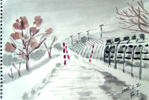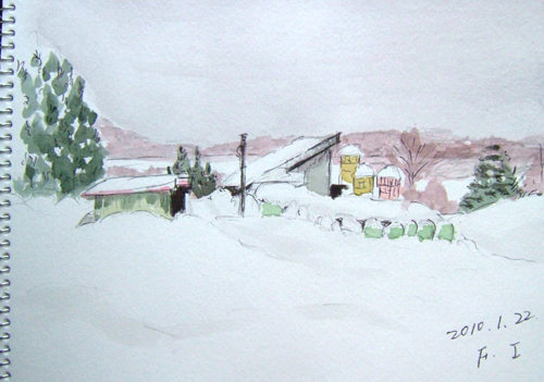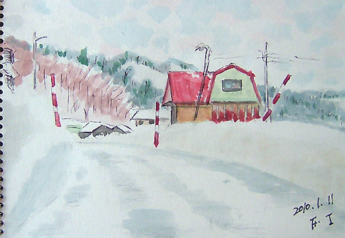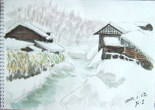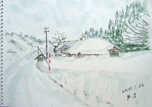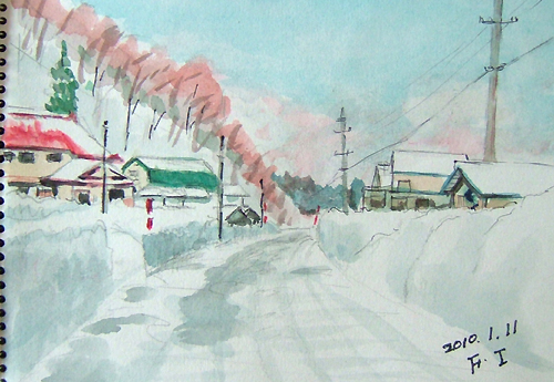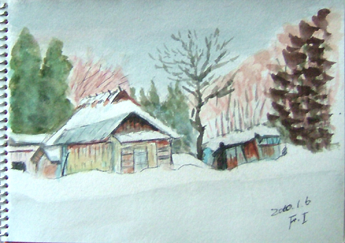 *:..。o○☆*゚¨゚ ・*:..。o○☆*゚¨゚゚・*:..。o○☆*:..。o○☆*゚¨゚゚・*:..。o○☆*゚¨゚゚・*:..。o 午前中、新年の初スケッチに誘われて、 久々に描いて来ました(=^▽^=) 今日の現場は、由利本荘市鳥海町・上原地区の道路防雪柵のある風景。 雪国の道路では至る所に備えられていますよ。 特に、吹雪いている時は有難い風物詩として味わい深いですね〜♪ で、本日の出来上がり〜(=^▽^=) ![]() 詳しくはこちら でご覧頂けます。 *:..。o○☆*゚¨゚ ・*:..。o○☆*゚¨゚゚・*:..。o○☆*:..。o○☆*゚¨゚゚・*:..。o○☆*゚¨゚゚・*:..。o お正月も終え、毎日雪が降ってもみぞれ雪の為、 雪は融けてしまい楽ちんしてます(=^▽^=) それでも、夜中に雪が降ったので、スケッチに誘われました 今日の現場は、由利本荘市鳥海町百合茎・集落風景です。。 茅葺屋根の民家は、本当に少なくなりましたよ。 民家の正面は遠慮して、横の方向から小屋をスケッチ。 茅葺屋根がバックに見えるだけです。。 で、本日の出来上がり〜(=^▽^=) 錆びた小屋・・・苦手です〜(^-^;) ![]() 詳しくはこちら でご覧頂けます。 *:..。o○☆*゚¨゚ ・*:..。o○☆*゚¨゚゚・*:..。o○☆*:..。o○☆*゚¨゚゚・*:..。o○☆*゚¨゚゚・*:..。o 午前中、久々の青空が出て来たので 又またスケッチ誘われました〜(=^▽^=) 今日の現場は、由利本荘市鳥海町中直根・道路上での風景です。 スケッチ場所を探しながらドライブ♪ 今日は、なんと2枚も描いて来ました(^▽^;)♪ で、本日の1枚目出来上がり〜(=^▽^=) ![]() 2枚目も同じく、由利本荘市鳥海町中直根・道路上での風景です。 雲も少なくなりブルースカイ♪ で、本日の2枚目出来上がり〜(=^▽^=) ![]() 詳しくはこちら でご覧頂けます。 *:..。o○☆*゚¨゚ ・*:..。o○☆*゚¨゚゚・*:..。o○☆*:..。o○☆*゚¨゚゚・*:..。o○☆*゚¨゚゚・*:..。o *:..。o○☆*゚¨゚ ・*:..。o○☆*゚¨゚゚・*:..。o○☆*:..。o○☆*゚¨゚゚・*:..。o○☆*゚¨゚゚・*:..。o 12〜13日、1泊で厳冬の乳頭温泉郷へ又また行って来ました(^▽^;)♪ 今回は、宿泊ホテルの手前にある『鶴の湯』に立ち寄り、スケッチと温泉楽しんで来ました♪ で、1枚目は、笹の葉の向こう側が混浴露天風呂です。 ![]() 2枚目も同じく、鶴の湯。右側の方ですo(*^▽^*)o♪ ![]() 3枚目は、翌日の帰りに田沢湖へも立ち寄り、雪に埋もれたたつこ姫像です(^-^;) ![]() 詳しくはこちら でご覧頂けます。 *:..。o○☆*゚¨゚ ・*:..。o○☆*゚¨゚゚・*:..。o○☆*:..。o○☆*゚¨゚゚・*:..。o○☆*゚¨゚゚・*:..。o 久々にスケッチして来ました〜(=^▽^=) 今日の現場は、由利本荘市鳥海町上原地区・牛舎のある風景です。 雪をかぶった丸い緑のボールは、牛の餌が入ってますよ。 スケッチ場所を探しながらドライブ、今日は、1枚だけで止めました(^▽^;)♪ で、本日の出来上がり〜(=^▽^=) ![]() 詳しくはこちら でご覧頂けます。 *:..。o○☆*゚¨゚ ・*:..。o○☆*゚¨゚゚・*:..。o○☆*:..。o○☆*゚¨゚゚・*:..。o○☆*゚¨゚゚・*:..。o 午前中、又またスケッチに誘われて、1枚だけ描いて来ました〜(=^▽^=) 今日の現場は、由利本荘市鳥海町・外山(そでやま)集落の風景です。 このお宅は、確か茅葺屋根でしたが、トタンに変えたのかしら?? いつの間にか空き家となっていました(~ー~;) ここにも、過疎が。。。 でも、絵のモデルとしては、イイですね〜(^▽^;)♪ で、本日の出来上がり〜(=^▽^=) ![]() 詳しくはこちら でご覧頂けます。 *:..。o○☆*゚¨゚ ・*:..。o○☆*゚¨゚゚・*:..。o○☆*:..。o○☆*゚¨゚゚・*:..。o○☆*゚¨゚゚・*:..。o |