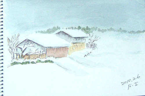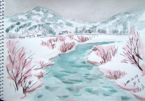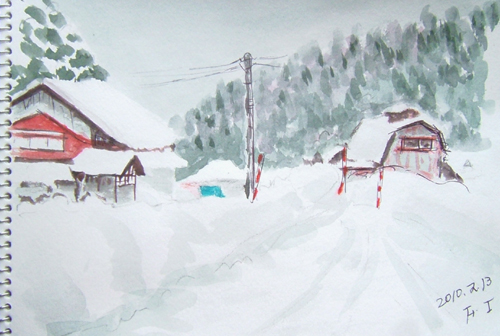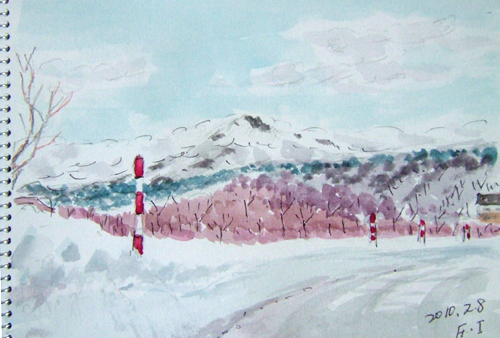 *:..。o○☆*゚¨゚ ・*:..。o○☆*゚¨゚゚・*:..。o○☆*:..。o○☆*゚¨゚゚・*:..。o○☆*゚¨゚゚・*:..。o 午前中、久々にスケッチに誘われ、1枚だけ描いて来ました〜(=^▽^=) 今日の現場は、由利本荘市鳥海町上原地区、 ホテル・フォレスタへ向かう道路でのスケッチです。 ず〜っと温暖な日が続いていて、積雪も無く、楽チンな日々を過ごしていましたが、 昨日から久しぶりの雪で久々の雪景色を描きましたよ。 11日ぶりのスケッチ、やはり遠近感のある定番な景色ですが、 赤い除雪目印棒とかミラーとか、ワンポイントですね〜(^▽^;)♪ で、本日の出来上がり〜(=^▽^=) ![]() 詳しくはこちら でご覧頂けます。 *:..。o○☆*゚¨゚ ・*:..。o○☆*゚¨゚゚・*:..。o○☆*:..。o○☆*゚¨゚゚・*:..。o○☆*゚¨゚゚・*:..。o 午前中、地元温泉&またまたスケッチに誘われ、1枚だけ描いて来ました〜(=^▽^=) 今日の現場は、由利本荘市鳥海町貝沢。 地元の温泉日帰り入浴を楽しんだ後の帰り道で 貝沢集落バイパス道路で猛吹雪に遭い、その様子を描いたのですが、 雰囲気ははどうかな〜(^▽^;)♪ で、本日の出来上がり〜(=^▽^=) ![]() 詳しくはこちら でご覧頂けます。 *:..。o○☆*゚¨゚ ・*:..。o○☆*゚¨゚゚・*:..。o○☆*:..。o○☆*゚¨゚゚・*:..。o○☆*゚¨゚゚・*:..。o 午前中、屋根から落ちた雪を早めに除雪後、久々のブルースカイなので またまたスケッチドライブで1枚だけ描いて来ました〜(=^▽^=) 今日の現場は、由利本荘市矢島町花立公園からの鳥海山です。 なんだか、すっかり春めいた感じがしました〜(^▽^;)♪ で、本日の出来上がり〜(=^▽^=) (AM:10:30頃) ![]() 詳しくはこちら でご覧頂けます。 *:..。o○☆*゚¨゚ ・*:..。o○☆*゚¨゚゚・*:..。o○☆*:..。o○☆*゚¨゚゚・*:..。o○☆*゚¨゚゚・*:..。o 昨日から雪が降り出し新雪が綺麗なので、近場の地元スケッチ、 2枚も描いて来ました〜(=^▽^=) でも、今日はカナダのバンクーバーで冬季オリンピック開会式が 午前11時からのライブ放送観たいので、忙しいスケッチでした(^▽^;) 今日の第一現場は、由利本荘市鳥海町・平根から 八木山に行く橋付近からの笹子川風景です。 山と川と雪だけの簡単スケッチ(^▽^;)♪ で、1枚目のの出来上がり〜(=^▽^=) (AM:10時頃) ![]() 2枚目は、由利本荘市鳥海町・八木山集落の風景。 笹子川スケッチを終えて帰る途中、 八木山集落内道路からの風景ですが、平凡ね〜(^▽^;)♪ で、2枚目の出来上がり〜(=^▽^=) (AM:10時40分頃) ![]() 詳しくはこちら でご覧頂けます。 *:..。o○☆*゚¨゚ ・*:..。o○☆*゚¨゚゚・*:..。o○☆*:..。o○☆*゚¨゚゚・*:..。o○☆*゚¨゚゚・*:..。o |