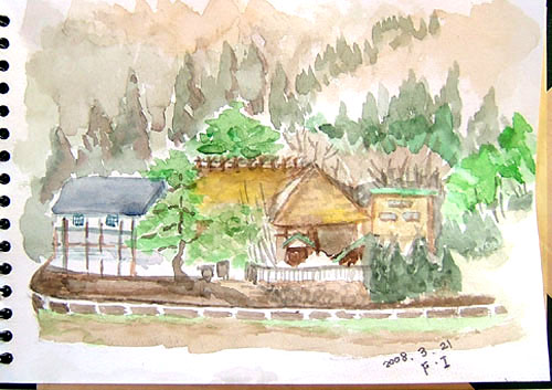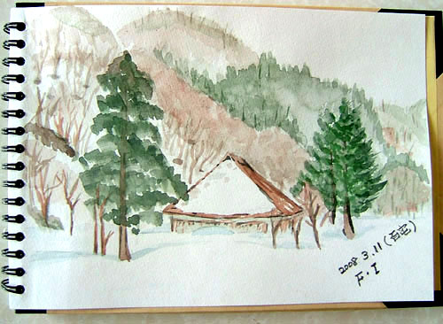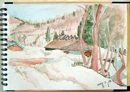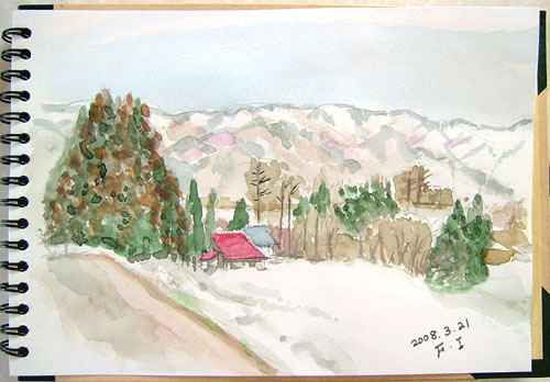 で、ご覧頂けます。由利本荘市鳥海町・上原集落の風景です。 バックの山並みが美しいので、描いてて楽しかったですが、どうかな?(^-^;)