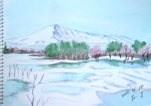 二日連続で描いた場所は、由利本荘市の由利原高原・ 大谷地池からの鳥海山でした〜♪
