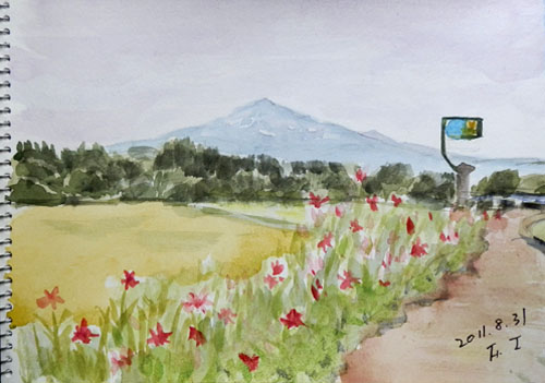 2枚目は、由利本荘市鳥海町八木山集落から芦ヶ渕集落に向かう道路から、 コスモスと鳥海山を描きました。