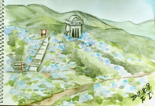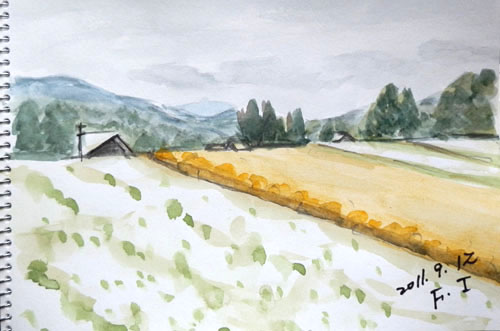 今日は久々に、毎朝ウォーキングしながら見ている蕎麦の 花畑風景のスケッチしました。