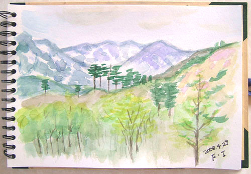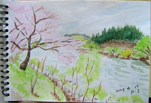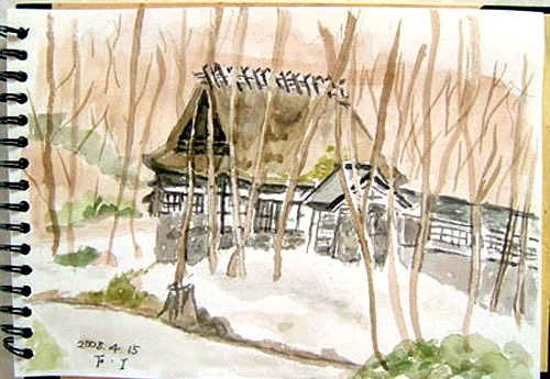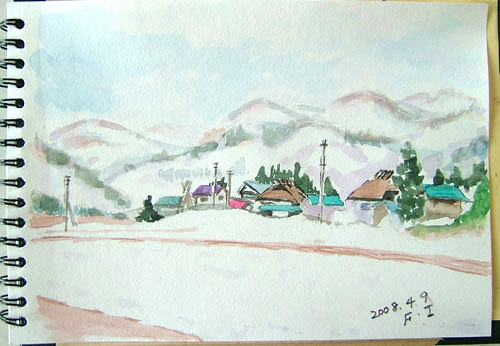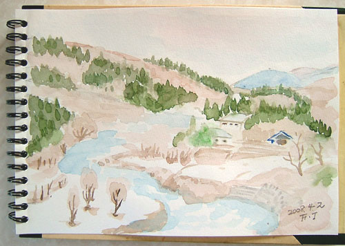 雪解けが進んで残雪も少しになりました。 春の到来は嬉しいですが、 ちょっぴり残雪が愛おしい気分になりますね〜(^-^;) ![]() 詳しくはこちら でご覧頂けます。 由利本荘市鳥海町・上笹子(かみじねご)の 中村集落です。 ご覧のように、田圃の残雪もこんなにありましたよ♪ 残雪を愛おしく思いながら、茅葺屋根のある雪景色のスケッチでした。 ![]() 詳しくはこちら 詳しくはこちら でご覧頂けます。 ここは、由利本荘市前郷地区を流れる子吉川にて、 川岸の萌黄色に芽吹いた柳をスケッチして来ました。 何と、30分くらいで描いた絵です(^-^;) ![]() 詳しくはこちら でご覧頂けます。 ここは、乳頭温泉・秘湯の宿「鶴の湯」別館をチェックアウトしてから、 宿の前から描いた、茅葺屋根です。 でも部屋は、バス、トイレ付きでなかなかお洒落でしたよ♪ ![]() スケッチ完成してから田沢湖に行き、雲のかかった「秋田駒ケ岳」も描くというので、描いてしまいました(^-^;) ![]() 詳しくはこちら でご覧頂けます。 ここは、由利本荘市鳥海町・大栗沢の子吉川です。 昨日一気に咲き出した桜と萌黄色の柳を描いてみました♪ 曇り空なので、どうかな?(^-^;) ![]() 詳しくはこちら でご覧頂けます。 ここは、我が鳥海町にある『法体の滝』です。日本名滝100選にも選ばれています。 今の時期は、雪解け水の為に水量が多く、弘法大師様のお姿が見えませんでした(^-^;) 短時間のスケッチ終了する頃、東京の両国(相撲) の近くから来られたというアマチュア・カメラマン?の おじ様とお喋り(^-^;)。 好きな人は、わざわざ、こんな遠くまで撮影に来られるんですよね〜(*^-゜)v ![]() 詳しくはこちら でご覧頂けます。 泥湯温泉(秋田県・湯沢市)帰りにスケッチ場所探し、ジュンサイ沼キャンプ場で、沼を描かず西方向の残雪と 新緑の景色に決定。30分くらいで描いてしまったかも〜(^-^;) ![]() |
