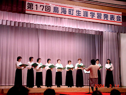 機会が毎年あり、今年も3月14日(日)町民会館「紫水館」で行われました。 不思議なもので、発表会という節目が あるからみんな頑張って練習したり、作品を仕上げたりします。自己主張の場として、各自得意な分野を お披露目できるということは、何よりの励みになると思います。 又、人との交流がボケ防止になると、発表後の講演会で 講師の酒井広氏(元NHKアナウンサー)も話されていました。年齢のわりには若く元気でユーモアたっぷりに話され、 生涯学習は健康作りの大切な一面と、認識したところです〜♪(2004/3/15) |