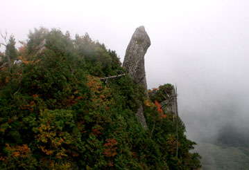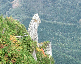 ![]() 10月4日(土)、天気予報は曇りのち一時雨。たぶん中止?と覚悟していたわりには、薄ら寒い登山日和に〜♪(それでも汗ビッショリ〜)。 まるで、ロッククライミング状態のところもあったりで、1000メーター足らずの登山ですが登山気分は充分味わうことが出来ました(^0^)/。 写真は男甑山頂上に到着したばかりの風景。お天気も良くなり、眼下に見えるのは烏帽子岩(えぼし岩)です。 |
