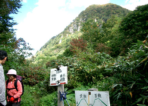 上の写真は、女甑山に登るか男甑山に登るかの分岐点。山には男と女が一体になった名前がよく付いているとのことです。 |