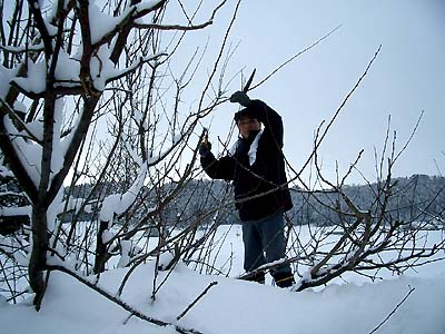 主人はシュガープルーンの無駄な枝の剪定をしていました。 2メートルの積雪になると、剪定が楽なんですよ〜♪